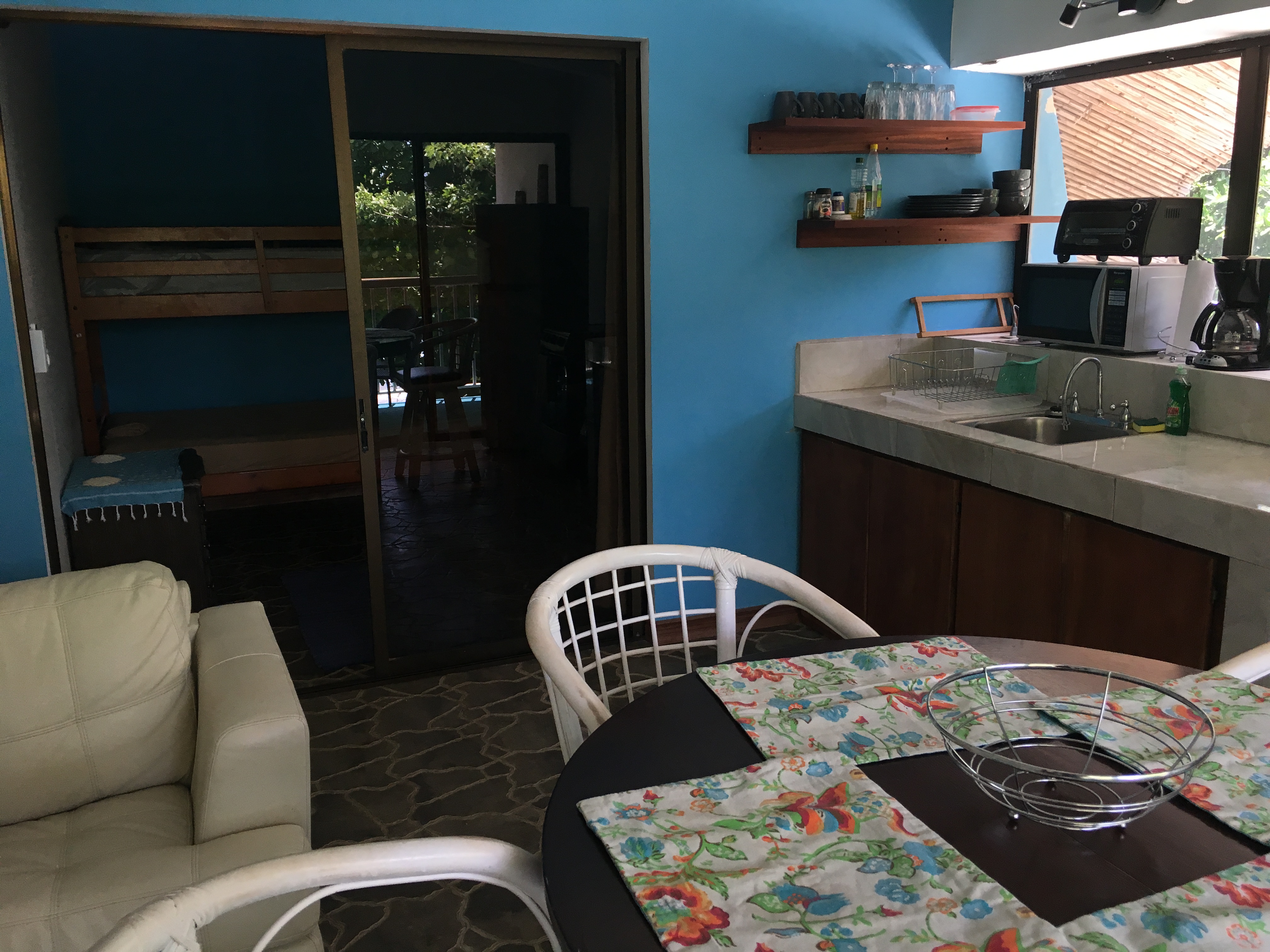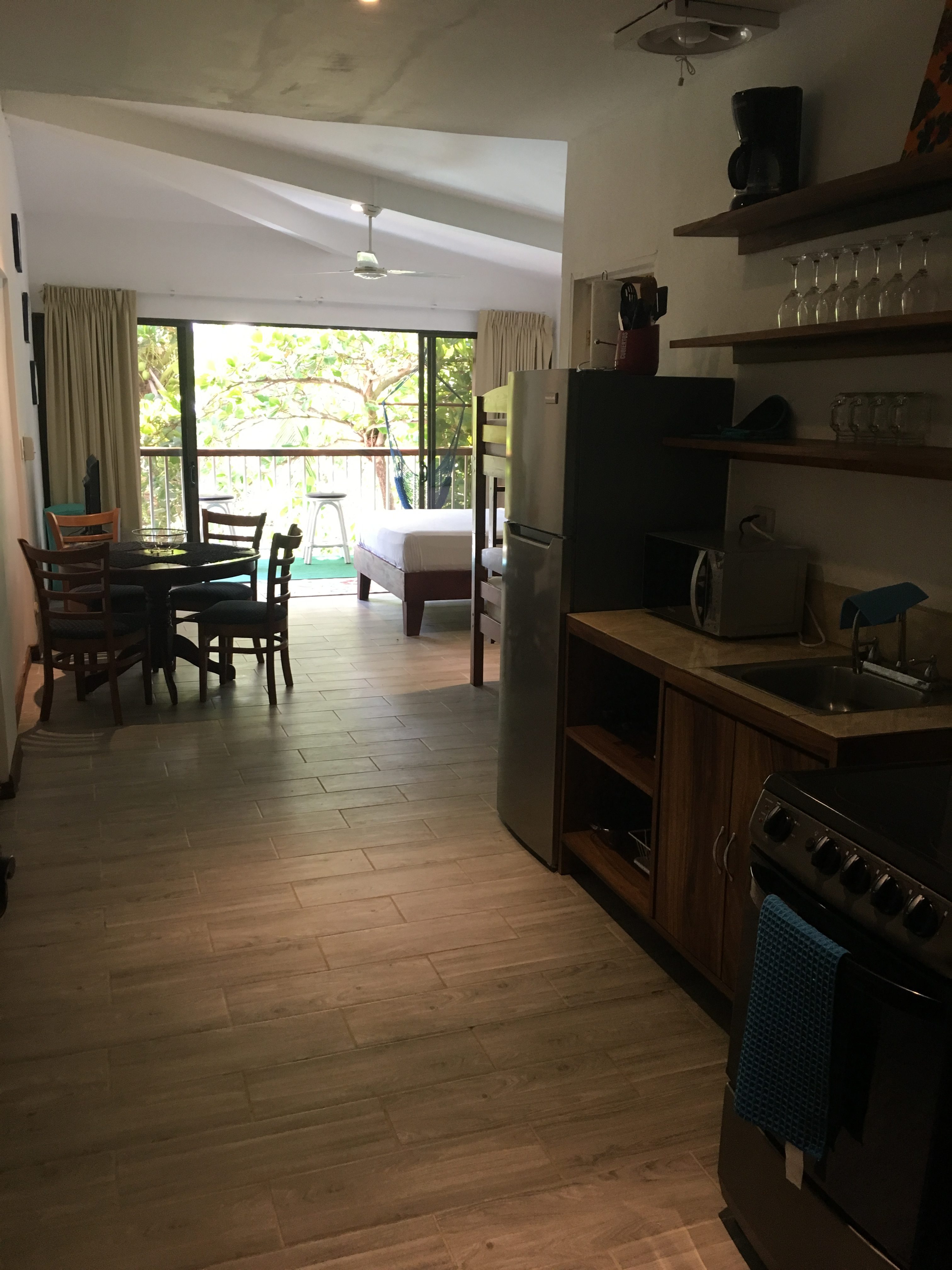 My studio had a tempurpedic queen bed and a bunk bed. The kitchen was completely accessorized so I could make my own coffee in the morning and stock fruits and leftovers in the fridge. The surf is right out back, and right after the shower felt great. I could have turned on the a/c, but the ceiling fan and having the back sliding doors wide open kept the place cool. In the afternoon and early evening there was some mellow live music from the restaurant next door, but it would just be the sounds of the waves at night.